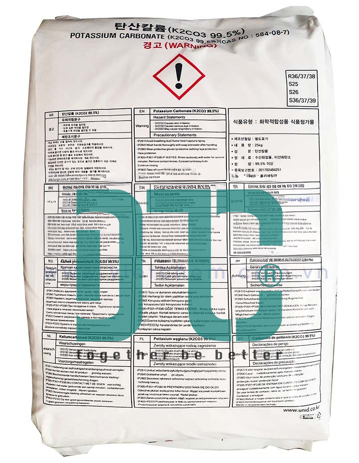 - Bảo quản: Lưu trữ trong bao bì kín, ở nơi khô ráo, thoáng mát, tránh ẩm ướt vì K2CO3 hút ẩm mạnh.
